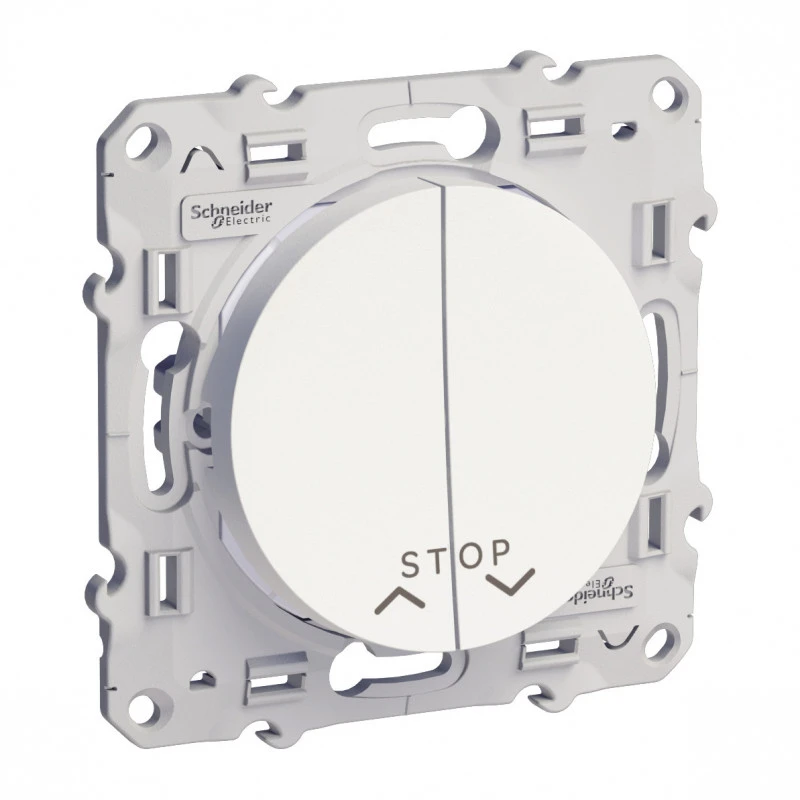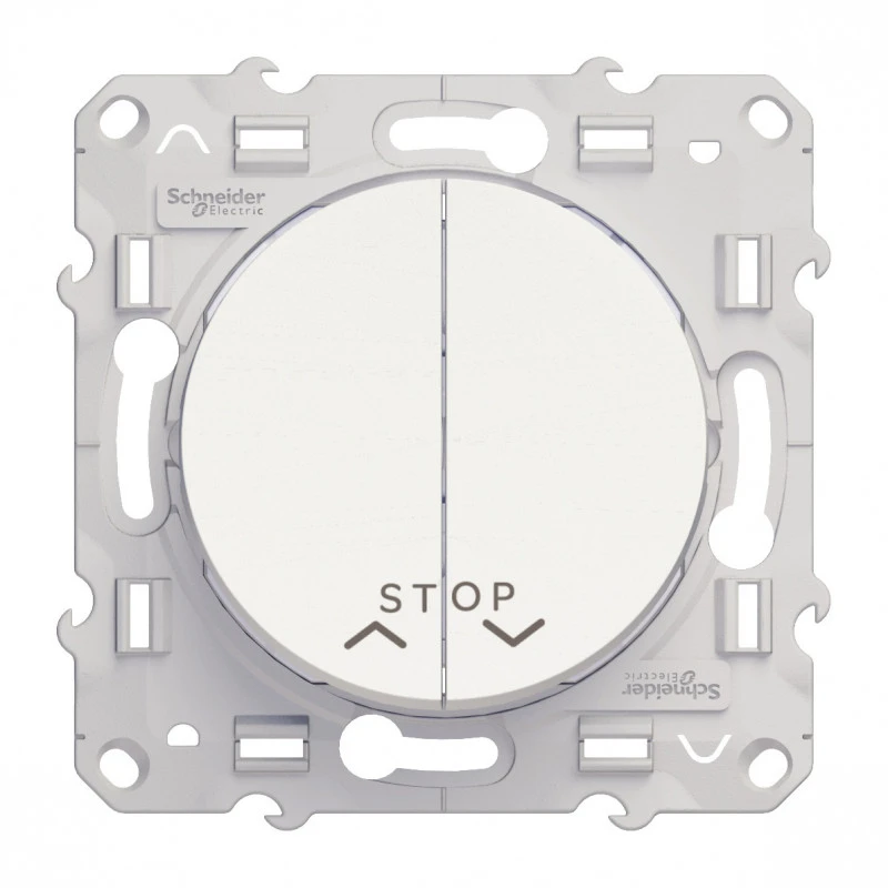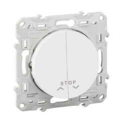 Odace – Double poussoir a vec fonction STOP pour volets-roulants – blanc RAL 9003 brillant – normâlement ouvert – Fixation par vis – Livré avec protection peinture – 10 A – 250 V CA 50/60 Hz – 3 bornes sans vis – IK04 – IP21 D