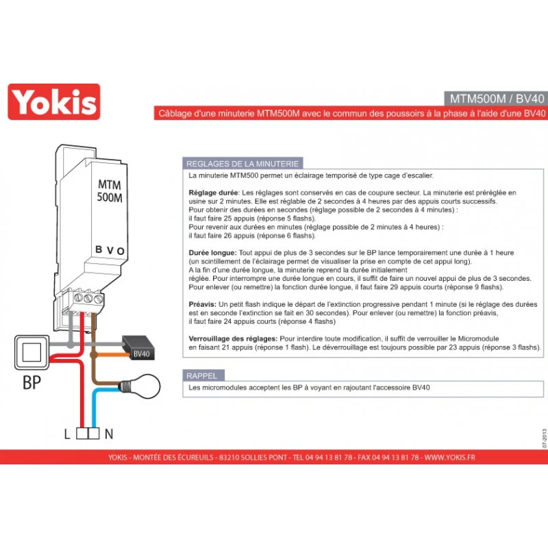 Le minuterie modulaire 500w MTM500M à une temporisation réglable de 2 secondes à 4 heures. Bobine protégée contre les appuis permanents. PRATIQUE : Une double temporisation permet un éclairage ponctuel d’une heure.